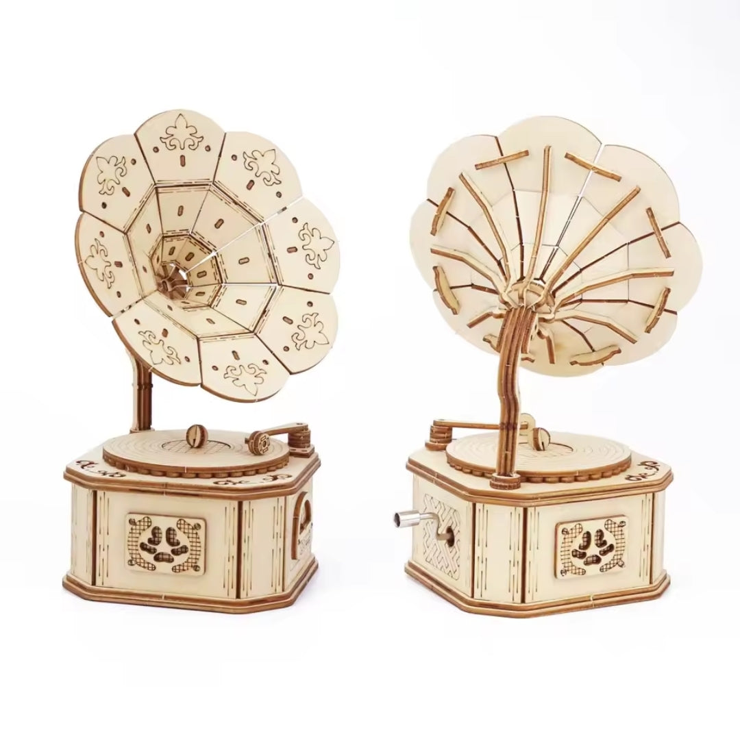 Atraskite nepakartojamą kūrybos ir muzikos derinį! Šis medinis 3D dėlionės modelis – gramofonas taps ne tik smagia pramoga surinkimo metu, bet ir išskirtine muzikine dėžute.